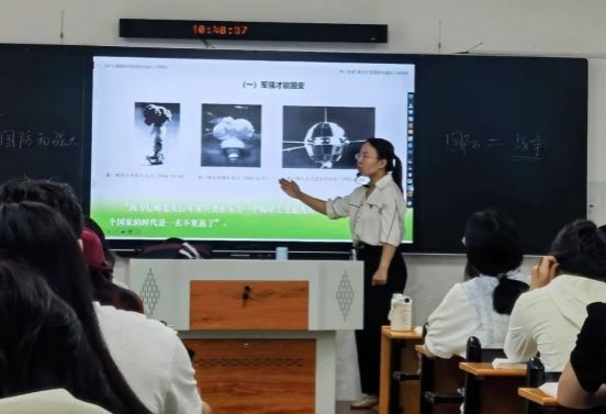 课堂上,高金慧展现出扎实的教学功底。她以当前国际局势中的叙利亚战火为切入点,巧妙结合《红海行动》和《战狼》等学生熟悉的主旋律电影,通过生动鲜活的影像案例剖析了国防与军队建设的重要意义。学生们全神贯注,深刻体会到“我们不是生活在一个和平的时代,而是生活在一个和平的国家”的深刻内涵。她以饱满的教学热忱投入课堂,感染力强,有效激发了学生们的爱国情怀与民族自豪感。
